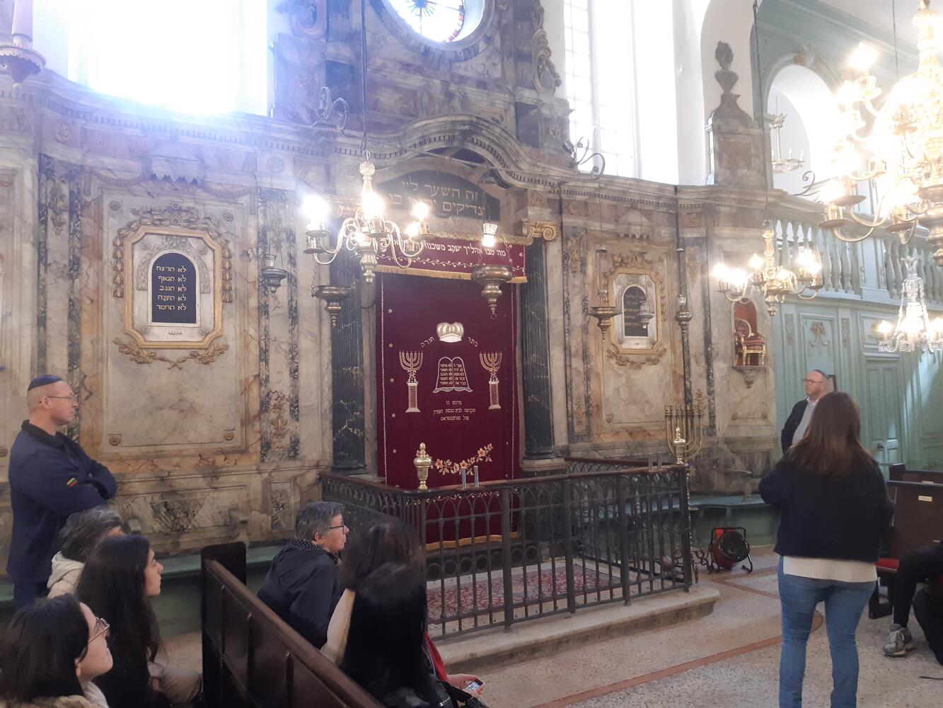Nous avons terminé notre visite dans la salle de prière, lieu où les fidèles se rassemblent pour les offices de Shabbat et des fêtes. Une caractéristique de cette salle est la présence des lampes Hanouka. Utilisées pour la fête des Lumières commémorant la purification du Temple par Judas Macchabée en 165 av JC, elles constituent le souvenir du miracle de la fiole d’huile qui brûla pendant 8 jours.