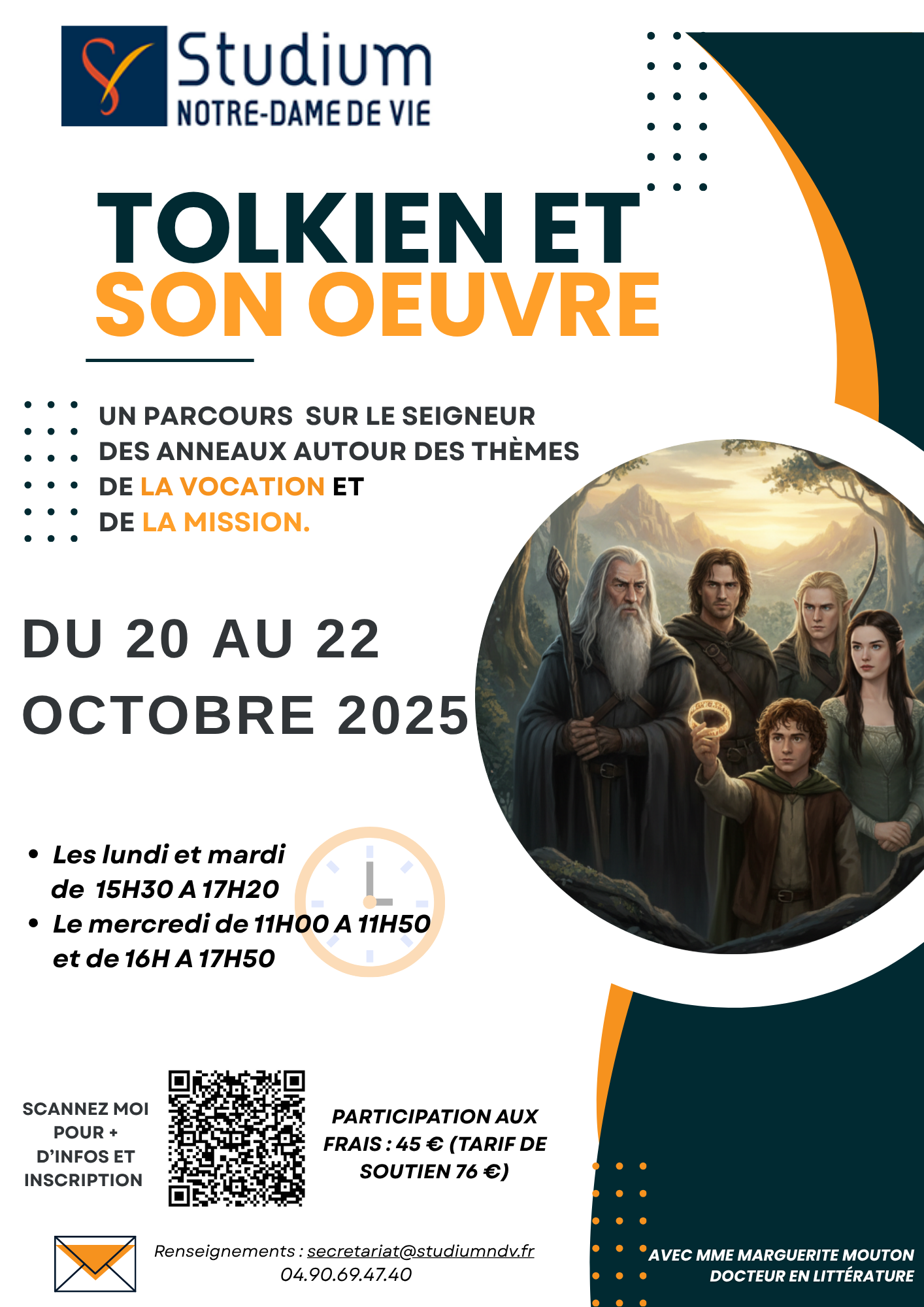 Le Pape François a insisté sur « l’importance de la lecture de romans et de poèmes dans le parcours de maturation personnelle », pour « apprendre à voir » et ainsi « s’approche[r] de l’invisible » (17/07/2024). En écho, J.R.R. Tolkien aimait comparer sa foi à une « lampe invisible » qui éclaire son œuvre sans jamais se montrer, une lumière qui « ne vient pas de lui, mais passe à travers lui » (Lettres, 1971). Ce cours entend répondre à l’invitation du Saint Père en proposant un parcours du Seigneur des Anneaux autour des thèmes de la vocation et de la mission.